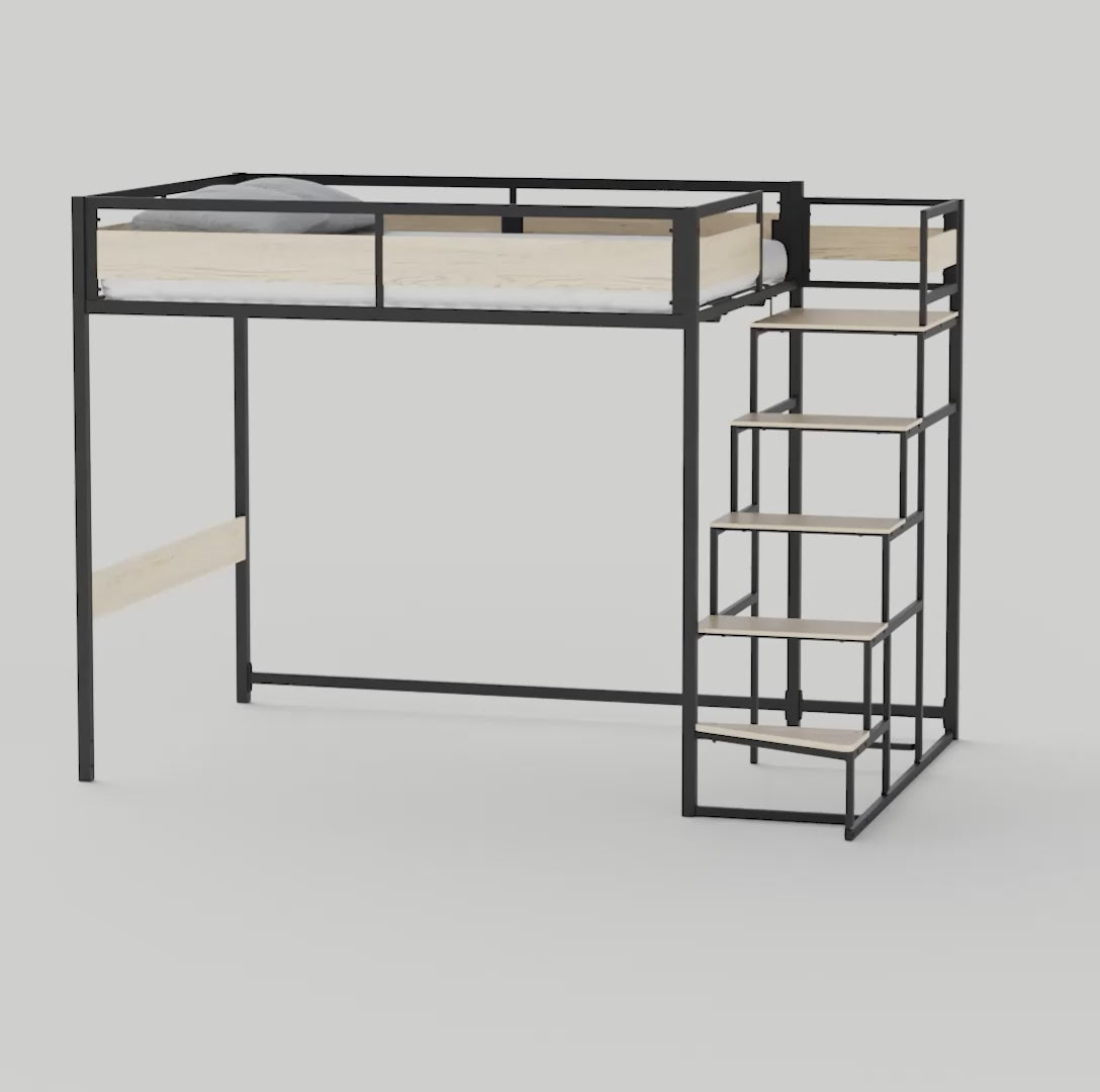 Hoogslaper met lattenbodem en omkeerbare trap in zwart metaal en eikenhouten melamine - slaapoppervlak 140 x 190 cm - MONTANA